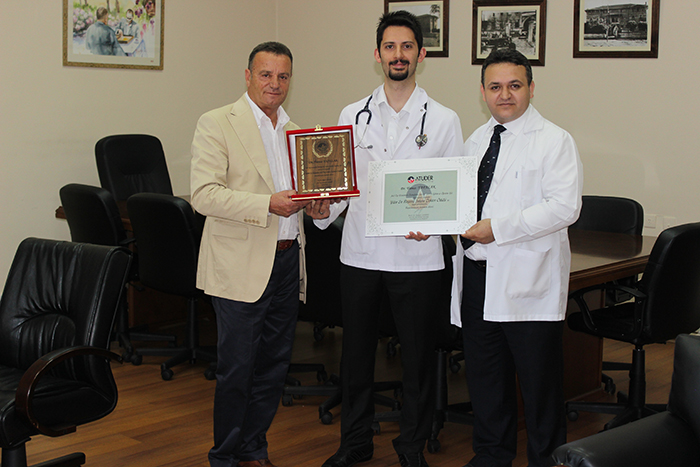 Dr. Yunus YAPALAK'a ödülünü Acil Tıp Uzmanları Derneği (ATUDER) adına Sayın Tıp Fakültesi Dekanı Prof. Dr. Özgün ENVER ve Acil Tıp A.D Öğretim Görevlisi Dr. Afşın İPEKCİ verdi.