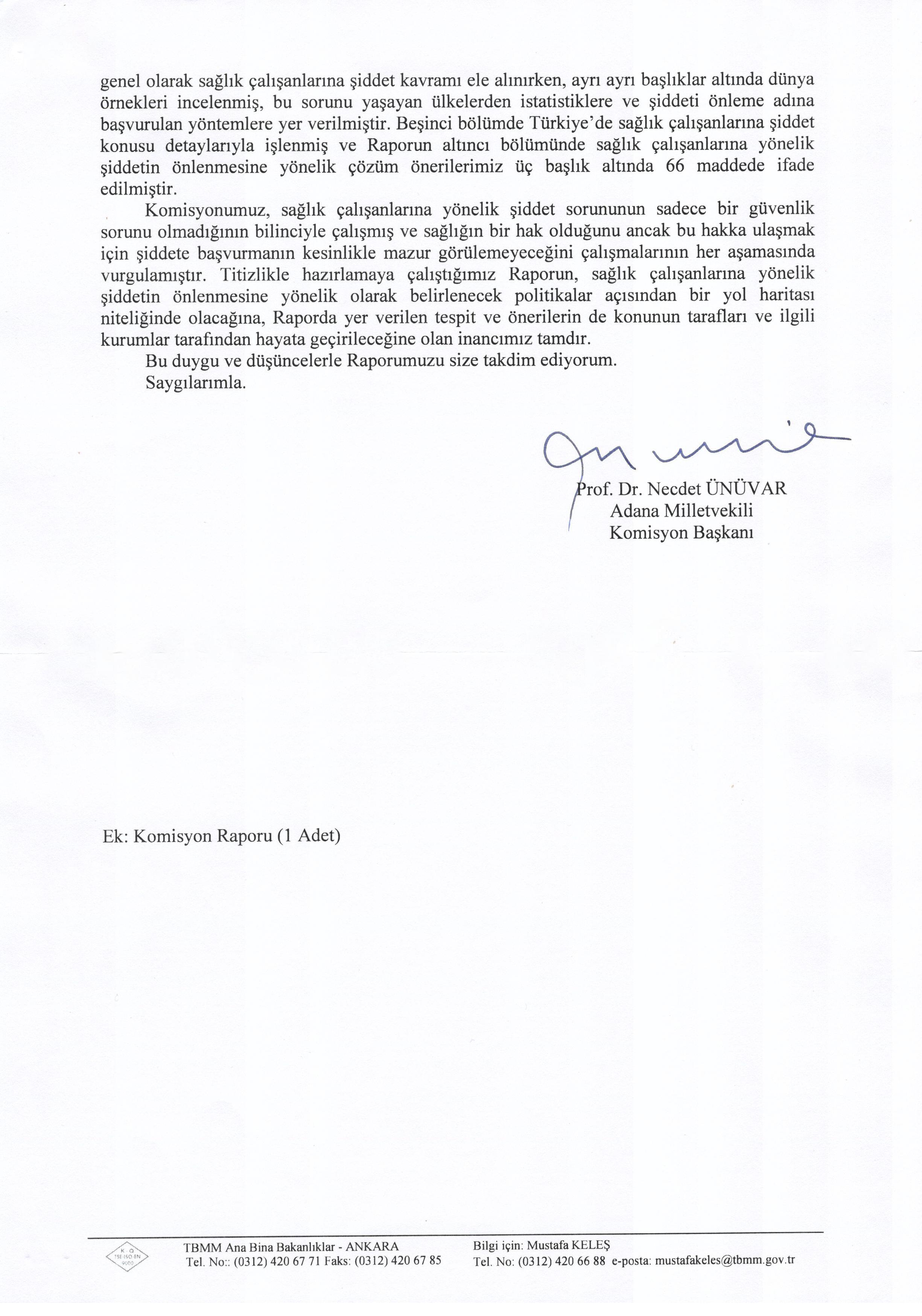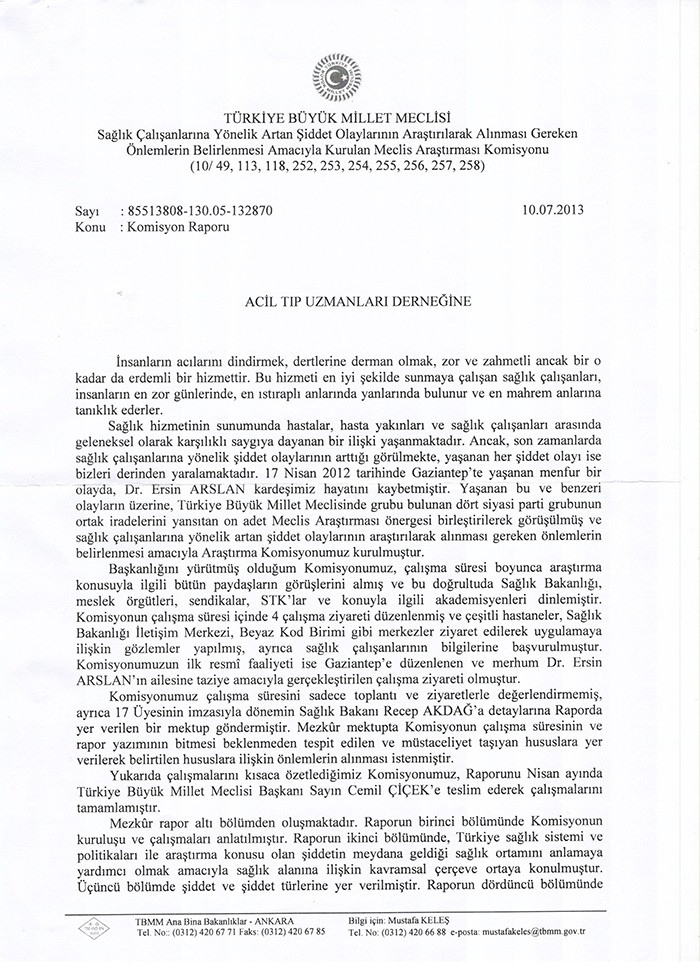 T.B.M.M 'nin Sağlık çalışnalarına yönelik artan şiddet olaylarının araştırılarak alınması gereken önlemlerin belirlenmesi amacıyla kurulan Meclis Araştırma Komisyonu Raporunu tamamlayarak Nisan 2013'de T.B.M.M meclis Başkanı Sayın Cemil ÇİÇEK'e teslim etmiştir.