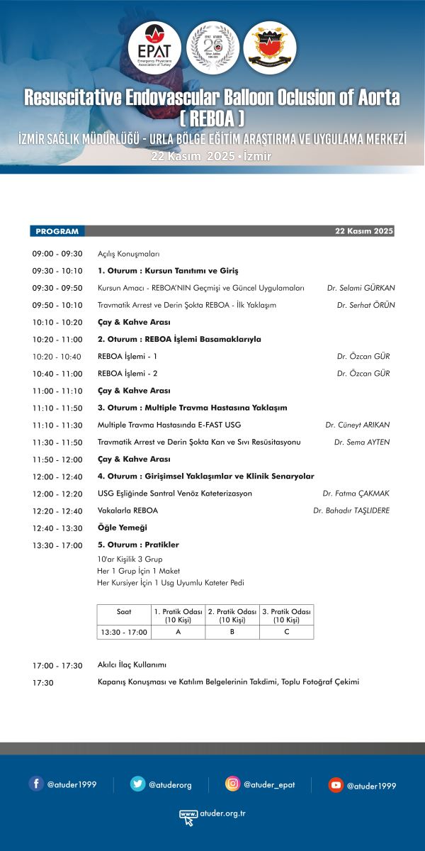 Kursumuzda her katılımcının eğitimciler eşliğinde orjinal simülasyon maketleri üzerinde ultrasonografi kılavuzluğunda REBOA işlemi gerçekleştirmesi sağlanacaktır