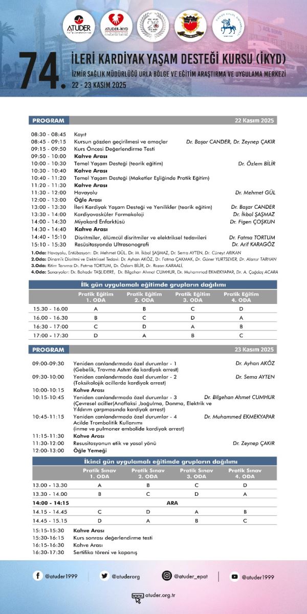 Acil Tıp Uzmanları Derneği (ATUDER) 'in 74. İleri Kardiyak Yaşam Desteği Kursu ( CPR- ACLS ), 22 Kasım 2025 Cumartesi - 23 Kasım 2025 Pazar tarihleri arasında Urla/İZMİR'de yapılacaktır.