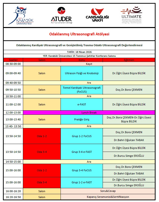 18 Nisan 2026 tarihinde Karabük Üniversitesi Tıp Fakültesi, Canan Bayraktar Toplum Sağlığı Vakfı (Can Sağlığı Vakfı) ve Acil Tıp Uzmanları Derneği (ATUDER) iş birliğiyle Odaklanmış Ultrasonografi Atölyesi (POCUS Workshop) düzenlenecektir.